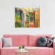 This colorful stretched canvas print features an adaptation of a fine art painting of a small street in St. Croix, Virgin Islands, by the American artist, Anna Unterman. The bright, sunny scene is a riot of colors. There is a red, pink and magenta bougainvillea vine over the archway as well as orange flame vines and other green shrubs and leaves. The colorful buildings are yellow, gold, blue and green. Reprinted with permission from the estate of Anna Unterman. All rights reserved.