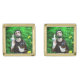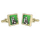 These cufflinks depict St. Francis of Assisi. Born in Assisi in 1182, he was a living manifestation to the world of Christ's poor and suffering life on earth. He is known to be the patron saint of animals and the environment. He was the founder of the Order of Friars Minor, more commonly known as the Franciscans. Here Saint Francis is portrayed with two white doves in a green field of yellow wildflowers.