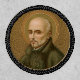 Spanish Basque nobleman and soldier turned priest and theologian, St. Ignatius Loyola (1491-1556) was founder and first Superior General of the Society of Jesus (the Jesuits). In this roundel, St. Ignatius is clad Jesuit style. He wears a simple black cassock, presumably wrapped and cinctured at the waist not buttoned down the front, and a collared black cape. On his chest, the Saint wears a Christogram, the official emblem of the Jesuits: the IHS monogram with the H surmounted by a cross above three nails and surrounded by a Sun. IHS (or iota-eta-sigma) stands for first three letters of the name of Jesus in Greek; the three nails, for the Passion; and the Sun, for the Son of God. Bound by a vow of special obedience to the Pope, the Jesuits undertook missionary work and education in orthodoxy under papal directives, playing an especially important role in the Counter-Reformation. The Jesuits’ motto in Latin coined by their founder is “Ad maiorem Dei gloriam (abbreviated AMDG)” and means "For the greater glory of God". + Feast: July 31 + Image Credit (BK 050): Antique image of St. Ignatius de Loyola, S.J., originally published in chromolithography by B. Kühlen, Mönchengladbach, Germany, unnumbered Jesuit Series, late 19th century, from the designer’s private collection of religious ephemera.