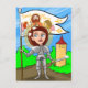Cartoon illustration depicting Saint Joan of Arc in armor with her banner.
