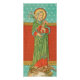 Add your text to the back of this versatile blank hand-out. + Here, a mature, gray-haired St. Joseph stands atop a globe in front of a red wall hanging with golden yellow trim and tassels. The tapestry is patterned with equal-armed crosses enclosed in rotated squares. How it is hung defies logical explanation because the background consists of an infinitely deep aqua-blue sky bespattered with stars. + St. Joseph is richly garbed in strong colors. His robe is red; his mantle, green with a dark aqua lining and golden yellow borders. He holds a spray of white lilies symbolizing purity in his right hand and an L-shaped brown wooden carpenter’s rule indicative of his profession in his left. + Beneath St. Joseph’s sandaled feet are a small dragon, a crown, a scroll, and a globe inscribed with the names of the populated continents—Asia, Australia, (North and South) America, Africa, and Europe. The dragon and the scroll represent threats to the Church. The dragon signifies Satan; the scroll, heresies by being a précis of Blessed Pope Pius IX’s 1864 Syllabus of Errors, a document articulating 19th-century philosophical and political positions hostile to Catholicism. The scroll reads: Non serviam (“I will not serve”) / Atheismus (Atheism) / Odium Ecclesiae (Hatred of the Church) ~ S. Pontifice (The Pope) ~ Episcopi (Bishops) ~ Presbyteri (Priests) / Liberalism. The phrase “Non serviam”, that is, “I will not serve”, is attributed to Satan who rejected God and was banished from heaven. Atheism, Anticlericalism, and Liberalism are self-explanatory and were movements that shaped Pius IX’s policies, especially regarding the unification of Italy and its rise as a modern nation-state. The towering figure of St. Joseph stamps out heresy and tramples underfoot Satan’s power over the world by crushing the dragon beneath his feet toppling the crown from the dragon’s head. + A much more elaborate, near-contemporary variant was issued as a black and white lithograph. (Compare our DT 01.) Like the black-and-white litho, this chromo- or color lithograph was published to promulgate Pope Leo XIII’s “Prayer to St. Joseph” of 1889. + Principal Feast of St. Joseph: March 19; Feast of St. Joseph the Worker: May 1 + Image Credit (VVP 09): Antique chromolithograph of Saint Joseph, Protector of the Church, Pray For Us [H. Jozef, beschermer der H. Kerk, B.V.O.] originally published by K[arel] v[an] d[er] Vyvere-Petyt, Bruges, Belgium, c. 1890, from the designer’s private collection of religious ephemera.