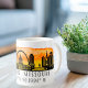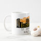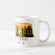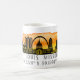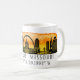 Coffee mug design features St. Louis Missouri city skyline silhouette with sunset watercolor splash background and latitude & longitude map coordinates.