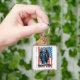Police keychains with St. Michael the Archangel. St. Michael is the patron saint of law enforcement and here he holds a police baton in each hand. Handcuffs hang from his belt with an American flag background. Religious police officer gift. Police across his chest and large angel wings. Defend Us in Battle banner. Keychains for police officers.