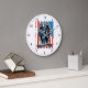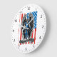 Great police clocks for officers! Never be late for your shift! St. Michael is the patron saint of law enforcement and here he holds a police baton in each hand. Christian police clocks. Handcuffs hang from his belt with an American flag background. Religious police officer gift. Police across his chest and large angel wings. Defend Us in Battle banner. Clocks for police officers.