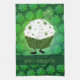 A kitchen towel with a smiling, cartoon, cupcake that’s decorated with white frosting and green shamrocks. This kitchen towel has a shamrock pattern background and customizable words: Happy St. Patrick’s Day!