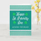 A pretty, country-style greeting card for St Patrick's Day from from far away, with green and white check gingham panels at the top and bottom, edged with white faux lace. The front cover greeting is, 'Happy St Patrick's Day' in white vintage lettering on the dark green background with four lighter green shamrock leaves at the four corners and, 'ACROSS THE MILES' in white capital letters below. The inside message is just a suggestion and you can easily change it or delete it if you wish.