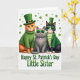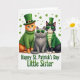 This greeting card shows three dressed-up cats posed close together on a white background sprinkled with small green shamrocks ☘️. On the left, a ginger cat with bright blue eyes wears a green top hat and a ribbed green sweater, leaning in with a sweet, friendly look. In the middle, a soft grey cat sports lime-green sunglasses and a small pink heart accessory, adding a gentle, affectionate touch between the trio 💚. On the right, a black-and-white cat stands confidently in a matching green top hat and green sunglasses, layered over a striped shirt and a blazer for a tidy, party-ready look. The lighting stays bright and even, keeping the colors crisp and the characters easy to see. Along the lower portion of the design, the message “Happy St. Patrick’s Day Little Sister” appears in green cursive lettering centered beneath the cats. Tiny shamrocks dot the open white space around their hats and shoulders, framing the group like light confetti. Share St. Patrick’s Day sentiments with someone you care about, and enjoy the scattered shamrocks and the green lettering beneath the trio.