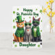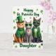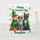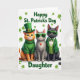 This greeting card features three dressed-up cats on a bright white background sprinkled with small green shamrocks, setting a light St. Patrick’s Day scene 💚. An orange tabby stands out in a leprechaun hat and green sweater, angled toward the others as if inviting them into the fun. Nearby, a grey cat in lime-green sunglasses wears a small red heart on its chest, adding a sweet, friendly touch to the group ☘️. A black cat completes the trio in a full green suit with a waistcoat and bow tie, its matching shades giving it a smooth, confident look. The cats cluster close together, their poses and slight turns toward one another suggesting an easy bond and shared joke. “Happy St. Patrick’s Day” appears in green lettering across the top, while “Daughter” sits centered at the bottom in the same green. The front design shows scattered shamrocks around the trio, with the orange tabby in the middle, the grey cat to one side, and the suited black cat to the other.