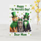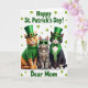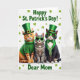 This card shows three dressed-up cats lined up side by side on a bright white background sprinkled with small emerald shamrocks, giving the scene a light, cozy holiday feel 💚. An orange tabby, a grey tabby, and a black-and-white tuxedo cat face forward with gentle, friendly expressions, like they’re posing together for a shared inside joke. Each cat wears green St. Patrick’s Day accessories—tall green hats with gold buckles, green sunglasses (including one pair with a brighter frame), and tidy outfit pieces like a turtleneck, a bow tie, and a vest over a striped shirt ☘️. The grey tabby’s little white heart pendant sits at the chest and adds a soft, affectionate touch among the matching greens. Across the top, “Happy St. Patrick’s Day!” is placed in a banner-style line that stands out clearly above their heads. Near the bottom, “Dear Mom” appears as a smaller note, set apart from the main greeting so it reads like a direct, caring add-on. The cats’ outfits show layered textures and shades of green, with gold accents on the hat buckles and shamrocks scattered evenly behind them.