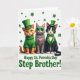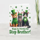 This card shows three cats lined up shoulder to shoulder on a white background sprinkled with small shamrocks ☘️. On the left, an orange tabby wears a green leprechaun hat and an emerald turtleneck, leaning slightly toward the others with wide green eyes that feel inviting and affectionate 💚. In the middle, a sleek gray cat has reflective green sunglasses and a tiny pink heart pin, angled just enough to look like it’s posing for a friend’s photo. On the right, a black-and-white tuxedo cat wears a green vest with gold buttons and a matching bow tie, topped with a smaller leprechaun hat, and its yellow‑green eyes seem to sparkle as it faces the group. The lighting is soft and even, making the fur look plush and the outfits look smooth without harsh shadows. Centered beneath the trio, the message “Happy St. Patrick’s Day Step Brother!” appears in green text. The shamrocks are scattered lightly around the cats, leaving plenty of open white space to frame their festive outfits.
