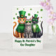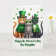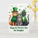 This greeting card shows three well-dressed cats posed together for St. Patrick’s Day on a bright white background sprinkled with small emerald shamrocks ☘️. On the left, a ginger tabby with big green eyes wears a cozy green turtleneck and a tall leprechaun hat with a gold buckle, leaning in like it’s ready for a friendly photo. In the middle, a sleek gray tabby keeps a calm, cool look behind lime-green sunglasses, and a small pink heart pendant rests at its chest, hinting at a sweet bond between the trio 💚. On the right, a black cat stands confidently in a green suit jacket over a green-and-white striped waistcoat, finished with a neat bow tie and dark green shades. The three cats are arranged close together in the center, their shoulders nearly touching, which makes the scene feel companionable and affectionate. Beneath them, the message “Happy St. Patrick’s Day Our Daughter” sits centered in green lettering, acting like a strong base for the illustration. Around the cats, the scattered shamrocks dot the white space like confetti, and the gold hat buckle and pink heart charm add small flashes of color. Share St. Patrick’s Day sentiments with someone special, and let the trio of cats stand out against the white field with shamrocks floating around them.