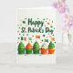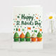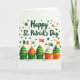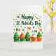 Designed with a tall, vertical layout, the card centers on five cupcakes lined up along the bottom against a bright white background. Each cupcake is topped with thick swirls of green and orange frosting, and one has vanilla frosting dotted with green-and-orange sprinkles, like a sweet little nod to sharing. Tiny flags rise from the cupcakes—one shows the Irish tricolor while the others are solid green or orange—standing close together the way friends lean in for a photo ☘️. Above the treats, the phrase “Happy St. Patrick’s Day” sits near the top in deep green lettering, easy to spot and nicely spaced. Small shamrocks and scattered dots in green and orange float around the page, adding motion without crowding the cupcakes 💚. Soft, even lighting makes the frosting look smooth and the flag edges look crisp. The shamrocks and dots are sprinkled mostly around the upper half, framing the green headline while leaving the cupcake row clearly defined.