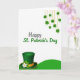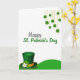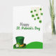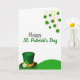 This card features a St. Patrick’s Day scene on a white background, where a cascade of green shamrocks hangs in the upper right like lucky charms on thin gold chains ☘️. Near the center, the phrase “Happy St. Patrick’s Day” is set in two tones, with “Happy” in soft grey and the rest in rich green, giving the message a gentle contrast. In the lower left sits an emerald-green top hat with a glossy look, trimmed with a golden band that feels like a little gift waiting to be noticed 💚. Tucked into the hatband is a small cluster of deep green leaves holding a white flower with a yellow center, a tender detail that reads like someone thoughtfully pinned it there for a friend. The hanging shamrocks tilt and overlap as they fall, adding a sense of motion, as if they’re drifting down toward the hat. Along the bottom edge, a darker green wave curves across like a low rolling hillside, balancing the open white space above. The greens range from soft to deep, with gold accents and subtle shading on the hat, while the shamrock strands remain gathered in the upper-right corner.