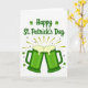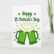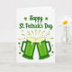 This greeting card features a bright St. Patrick’s Day scene on a white background, built around rich greens and a few soft yellow accents. Across the top, the words “Happy St. Patrick’s Day” sit large and easy to read in deep green, with small shamrocks tucked around the lettering ☘️. Below the text, two emerald beer mugs lean toward each other mid-clink, their tilt and closeness suggesting a friendly toast that could just as easily be shared between sweethearts. Thick, creamy foam spills over the rims in pale yellow, sliding down the sides like the moment is too cheerful to stay contained. Around the mugs, short radiating lines and scattered circles pop outward, hinting at fizz, laughter, and the quick sparkle of a shared glance 💚. A few more shamrocks dot the open space, keeping the layout balanced without crowding the center. The mugs are outlined with simple highlights and the foam forms rounded drips that hang over the glass edges.
