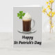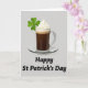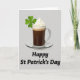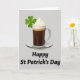 This card shows a tall clear glass mug centered on a light gray background, filled with a layered drink that looks like stout or coffee, topped with a creamy band and a high swirl of white whipped cream 💚. Soft, even light glints off the glass handle and rim, making the layers look neatly separated and easy to savor. Just behind the mug sits a large four-leaf clover in fresh green ☘️, angled like it’s leaning in close, as if keeping the drink company. The warm brown tones and the bright green leaf play off each other, giving the scene a cozy, friendly kind of closeness. Along the bottom edge, the phrase “Happy St Patrick’s Day” is placed in a strong, easy-to-read style, standing out clearly against the pale background. The letters sit low and centered, acting like a base that grounds the mug and clover above. The whipped cream’s small peaks are sharply defined, with tiny highlights tracing the curves while the clover’s rounded leaves fill the space behind the glass.