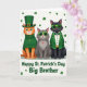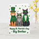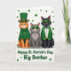 On the front of the card is a digital illustration of three dressed-up cats standing close together on a white background sprinkled with small dark green shamrocks ☘️. The ginger cat on the left wears a tall green leprechaun hat with a gold “G” buckle, a matching green turtleneck, and a small gold pendant that sits neatly at the center of its chest. In the middle, a gray cat leans in with neon green sunglasses and a small red heart patch on its chest, adding a sweet, friendly note to the group 💚. On the right, a black cat wears green shades and a green tuxedo jacket over a white shirt with green buttons, finished with a tidy bow tie. The three figures feel connected through their matching greens and the way their outfits echo one another, like friends posing for a festive photo. Below the cats, the message “Happy St. Patrick’s Day Big Brother” is placed in a deep green color, set in thick, easy-to-read lettering. The scene stays bright and simple, with scattered shamrocks floating around the trio against the white space.