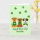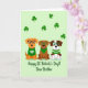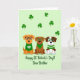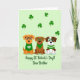 This St. Patrick's Day card shows three friendly, human-like dogs lined up in a horizontal row, leaning close as if posing for a shared photo 💚. On the left, a golden-brown dog wears black glasses and an emerald sweater with a white shamrock on the chest, smiling toward its pals. In the middle, a chocolate-brown dog has green-framed glasses and a matching green bandana, angled slightly toward the others with an easy, affectionate grin. On the right, a brown-and-white patched dog wears green glasses and a green-and-white striped sweater, tucked in close to complete the cozy trio ☘️. Behind them is a pastel green background sprinkled with smaller, darker green shamrocks, keeping the scene light and festive. Along the bottom, the message “Happy St. Patrick’s Day!! Dear Brother,” is set as a single line of dark green text, neatly anchoring the design. The green details repeat across their glasses and clothing, and the shamrock pattern floats evenly across the soft green backdrop.