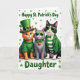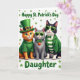 This card shows three dressed-up cats standing close together on a bright white background sprinkled with small green shamrocks ☘️. In the middle, a ginger cat with wide emerald eyes wears a green top hat with a gold buckle and a snug green sweater, leaning in as if happily anchoring the group. On one side, a grey cat in neon-green sunglasses and a green bow tie has a shiny red heart on its chest, angled toward the others like it’s sharing a private joke 💚. On the other side, a black-and-white tuxedo cat matches the green sunglasses and bow tie, topped off with a green blazer over a striped shirt, standing shoulder-to-shoulder with the grey cat in an easy, friendly pose. The phrase “Happy St. Patrick’s Day” sits above their heads in bright green lettering, centered near the top. The word “Daughter” appears below the trio in the same green, centered near the bottom. Tiny shamrocks dot the open space around them, framing the cats without crowding the scene.