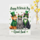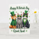 Designed with three dressed-up cats posed close together on a light cream background sprinkled with small shamrocks, this St. Patrick’s Day scene feels friendly and a little flirty in the way the trio leans in as if sharing a joke 💚. On the left, a ginger tabby with bright green eyes wears a green hooded sweater and a tall green top hat, its face turned toward the others with an eager, affectionate look. In the middle, a sleek grey cat sits calmly in lime-green sunglasses, and a small pink heart pendant at its neck adds a sweet, romancing touch. On the right, a black-and-white tuxedo cat wears a matching green top hat and green sunglasses, plus a fitted green blazer with gold buttons and a neat bow tie, angled slightly toward the center like it’s posing with friends. Above their heads, the words “Happy St. Patrick’s Day” curve in a dark green, flowing calligraphic style across the top. Near the bottom, “Great Aunt” appears as a dedication in green text, centered beneath the cats ☘️. The greens range from soft to bright against the cats’ fur tones, and tiny shamrock accents dot the background around the trio.