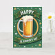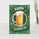 This design shows a golden-amber pint glass at the center, topped with a thick, creamy foam that slides down one side like it was just poured, giving the scene a cozy, inviting feel 💚. A golden-orange circular band wraps around the glass, while dark green ribbons curl outward as if they’re gently hugging the drink in celebration. The word “HAPPY” sits above the glass on the upper ribbon in white letters, and “ST. PATRICK’S DAY” stretches across the lower ribbon in matching white text. Behind it all, a deep green background sets the holiday setting, like a lively pub wall dressed up for March 17. Shamrocks—some filled in, some outlined—float around like friendly little nods passed between close friends ☘️. White and golden-orange dots scatter across the backdrop like confetti, adding movement and the sense of a shared toast across the room. The glass catches small highlights along its rim and handle, with a subtle sheen that makes the beer look freshly chilled and ready to clink.