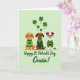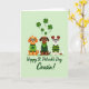 This greeting card shows three friendly, humanlike dogs standing shoulder to shoulder in a neat row on a pale green background, their close spacing and soft smiles suggesting easy friendship. One dog has golden-orange fur, the next is deep chocolate brown, and the third is white with a brown patch over one ear, and each wears round black-rimmed glasses that make their bright eyes feel extra attentive. Their outfits stay in the St. Patrick’s Day theme with different green looks: a solid green sweater with a shamrock, a green V-neck paired with a green bandana, and a green-and-white striped sweater. Above their heads, five shamrocks drift upward like little lucky thoughts, adding motion and a festive touch ☘️. The main message sits lower on the front, written in dark green lettering that reads, “Happy St. Patrick’s Day Cousin!” with the words stretching across the bottom. The pale green backdrop keeps the focus on the trio, while the darker greens in the clothes and text add contrast 💚. A cluster of shamrocks floats in the open space above the dogs, rising toward the top edge of the card.