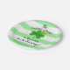 This paper plate design features a cute, smiling four leaf clover over a green and white striped background.