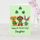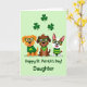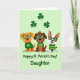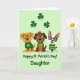 This design shows three cartoon dogs lined across the lower middle of a light green background, their bodies angled close as if they’re posing together for a friendly photo 💚. On the left, an amber pup wears a green sweater with a shamrock on it, leaning slightly toward the others with an eager grin. In the center, a dark brown dog sports a green bandana and looks side to side with bright eyes, like it’s sharing a private joke with its pals. On the right, a white-and-brown terrier in a striped green jumper stands snugly near the group, adding a cozy, companionable feel ☘️. All three wear matching green-rimmed glasses, and their wide smiles and open expressions make the trio feel close-knit and affectionate. Above them, dark shamrocks are scattered across the upper area, and the greeting “Happy St. Patrick’s Day!” appears in large green lettering with “Daughter,” placed nearby in a smaller matching green font. The scene stays simple and festive with layered greens, the dogs centered below, and the shamrocks floating overhead.