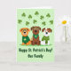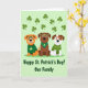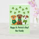 This card shows three friendly dogs posed together on a soft light-green background that feels like early spring, with a darker green curve of ground beneath their paws. From above, small emerald shamrocks drift down like confetti, adding a lucky touch ☘️. On the left, an orange pup in a green sweater with a clover wears green glasses and leans slightly toward the middle, as if nudging closer for the group photo. In the center, a chocolate-brown dog with a neatly tied green bandana patterned with a clover looks calmly ahead through matching green frames, giving the others a steady, caring presence 💚. On the right, a white-and-brown patched dog in a green striped sweater sports orange glasses and tilts its head with an easy grin, completing the cozy trio. Across the upper portion, the message “Happy St. Patrick’s Day! Our Family,” sits as a clear overlay in green lettering, standing out against the pale background. Shamrocks scatter around their ears and glasses while the green sweaters and bandana echo the soft green backdrop and the darker green ground arc.