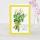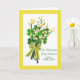 St. Patrick's Day Wishes! For a Dear Aunt, paper greeting card. Framed in bright yellow with a bouquet of springs of yellow forsythia, catkins, and clovers in various shades of green. Photograph of a springtime bow with yellow stripes and white polka-dots. Art, image, and verse copyright © Shoaff Ballanger Studios, 2021.