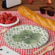 These whimsical St Patrick's Day paper plates features a watercolor four leaf clover with a coordinating green and white gingham background.