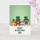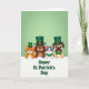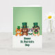 Designed with a soft gradient of leafy green in the background, the scene shows four cartoon-style animals leaning over a wide white strip as if they’ve gathered close for a friendly photo 💚. From left to right there’s an orange striped cat, a brown dog, a gray-and-white striped cat with bright blue eyes, and a tan dog with a long snout, all lined up shoulder to shoulder. Each one wears a tiny green top hat with a gold buckle, and the two cats plus the tan dog also have green bow ties that make them look like they dressed up together for the day ☘️. Their wide eyes and open smiles suggest an easy closeness, like friends nudging in to fit into the frame, with the tan dog’s tongue peeking out in a teasing, affectionate way. The animals’ paws rest on the top edge of the white strip, making it feel like they’re popping up to greet you from behind it. Across the center of that white strip, the message “Happy St. Patrick’s Day” appears in dark green lettering, standing out clearly against the pale space. The hats sit slightly tilted, and the gold buckles catch the light against the calm green background.
