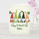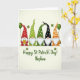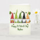 This card shows five gnomes lined up across the lower third of a creamy, parchment-like background, leaving lots of open space above their tall, curved hats. Each gnome has an extra-long fluffy white beard and a small rosy nose, and the way they lean slightly toward one another feels like a friendly little parade of companions. Their outfits mix red, several shades of green, black, and warm orange, with most hats covered in white polka dots while one stands out with orange stripes. On the far left, a gnome holds a golden tankard, and on the far right, another is tied to a green balloon with a small golden pot nearby, hinting at a lucky find ☘️. Small shamrocks are scattered around them, adding tiny pops of green that echo the holiday theme 💚. Below the figures, the message “Happy St. Patrick’s Day! Nephew” sits centered near the bottom in green lettering. The balloon is a rounded green shape floating just above the rightmost gnome’s hat, with its string trailing down toward his side.