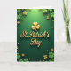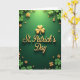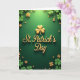 This card features “St. Patrick’s Day” centered in textured gold lettering, with a small gold three-leaf shamrock placed just above the words like a sweet little crown ☘️. The background is a deep emerald green that fades into a lighter glow near the top center, as if a soft spotlight is shining down. Around the edges, muted green shamrocks sit like gentle companions, curving inward and framing the message with an easy, friendly closeness 💚. Between them, tiny gold four-petal flowers add warm sparkles that echo the gold text without stealing attention. Smooth amber-orange beads are scattered nearby, like small polished drops that catch the light and add depth. The mix of grainy gold texture, velvety green shapes, and glossy beads makes the layout feel inviting, like a shared toast between friends. The gold title stays in the middle while the shamrocks, flowers, and beads ring the border against the green gradient backdrop.