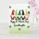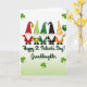 This card shows five gnomes lined up across the center, their long white beards and small pink noses tucked under tall cone hats patterned with polka dots, stripes, and tiny shamrocks 💚. Greens lead the palette, with touches of red, orange, and black adding contrast across their hats and outfits. Behind them, the background fades from white into a light lime green, and small bright green shamrocks float around the scene like a gentle frame ☘️. One gnome lifts a golden tankard as if toasting friends, while another hugs a shiny pot of gold close as though saving it for someone special. On the far right, a gnome holds a bunch of green balloons that lean outward, adding a sense of movement and shared excitement. Beneath the row of gnomes, the message “Happy St. Patrick’s Day! Granddaughter,” sits centered in dark green lettering. The shamrocks are scattered near the edges, and the balloons rise above the rightmost gnome in a soft arc.