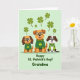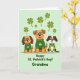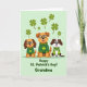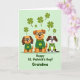 This card shows three cartoon dogs lined up close together along the lower half of a light mint green background, their shoulders nearly touching like good friends posing for a photo 💚. Two warm brown pups with floppy ears wear black-rimmed glasses and ribbed green sweaters, each with a shamrock emblem centered on the chest. The third dog, marked in white and brown, leans in from the right with a diagonally striped green-and-lime scarf wrapped neatly around its neck ☘️. Their wide, toothy smiles and bright, sparkling eyes create a cozy, affectionate energy, as if they’re sharing a little inside joke. Above their heads, four-leaf clovers in mixed sizes float upward in a loose scatter, adding motion against the simple backdrop. Along the bottom edge, the message “Happy St. Patrick’s Day! Grandma,” sits in deeper emerald green text, anchoring the scene beneath the trio. The clovers continue to drift across the upper area, spaced out so the mint background shows through between them.