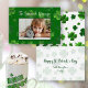 Green clovers photo card for grandparents on St. Patrick’s Day. Folded, horizontal car has a place for a photo on the front, framed in green. White text at the top can say “to” with name / names. Inside, add your message and signature over a background of four-leaf clovers. This card comes in three sizes. Although the sample is for grandchildren to send, it is a thoughtful card to send to anyone on the Irish holiday.