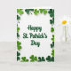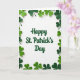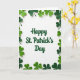 This card features “Happy St. Patrick’s Day” centered in a flowing, wavy green style, standing out against a bright white background. The lettering sits right in the middle, and its rich green color draws your eyes in like a friendly note meant to be read up close 💚. Around the edges, a frame of shamrocks wraps the message in a gentle, welcoming border, like a little green hug. Each clover shows slightly different shades—from light lime to deep forest green—adding variety while still looking nicely matched. Soft shading gives the leaves a subtle raised look, as if they’re resting on top of the white surface instead of being flat. The simple layout leaves plenty of open space, making the central words feel like they’re meant for someone special, whether a close friend or a sweetheart ☘️. The text remains neatly centered while the shamrocks stay mostly along the perimeter, keeping the focus clear and calm. In the corners and along the sides, the shamrocks appear scattered in an even ring, with rounded leaves and gentle shadows against the white.
