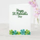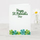 This card features a crisp white background with “Happy St. Patrick’s Day” set across the upper area in flowing dark green lettering, drawing your eye like a friendly greeting from across the room. The tall, graceful curves of the text feel like an easy arm-in-arm moment between friends, light and affectionate without needing extra fuss. Plenty of open space sits beneath the message, keeping the layout airy and letting the design breathe. Along the bottom edge, a decorative band of stylized five-petal flowers forms a modern border in layered shades of green, from lime to deep emerald, with touches of teal 💚. The semi-transparent petals overlap like stained glass, creating soft shifts in color where shapes meet and suggesting closeness through their gentle interweaving. The main text stays clearly separated above, centered and dark green, while the floral border remains anchored low for contrast ☘️. At the very bottom, the overlapping petals create a mosaic-like strip with rounded flower shapes and translucent teal accents against the white field.