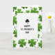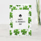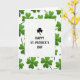 This greeting card centers on a square white panel that sits neatly in the middle, like a calm window inside a lively frame. Inside the panel, “HAPPY ST. PATRICK’S DAY” is set in black, all-caps lettering, with a solid black shamrock placed above the words as a simple topper. A faint layer of pale shamrock shapes seems to rest under the white surface, adding a soft texture that feels like a quiet nod shared between friends 💚. Around that center, a field of three-leaf clovers in deep emerald green spreads across the border, their rounded leaves shaded just enough to look gently raised. Some clovers drift close together while others sit apart, creating the kind of easy, unforced closeness that reads like friendly company on a bright day ☘️. A few leaves reach toward the edge as if the pattern continues beyond the card, keeping the scene open and roomy. The border’s green shamrocks float over a lightly textured white background, with scattered clovers partly cut off at the outer edges.