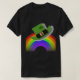 This man’s black T shirt features a colourful Rainbow and Leprechauns Hat on a lush green background. Perfect for St Patrick’s Day Parties