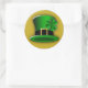 © Sunny Mars Designs. St Patrick’s Day Green Leprechaun Hat Custom Round Stickers – These adhesive stickers feature a green leprechaun hat with a black band around it, a gold buckle and a shamrock attached to it.