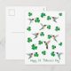 Whimsical St. Patrick's Day postcard with hand-painted ruby-throated hummingbirds and shamrocks.