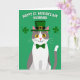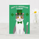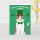 This greeting card features a stylized cat centered on a rich green background, dressed up for St. Patrick’s Day with a deep emerald leprechaun hat and a matching green bow tie ☘️. The cat’s face and chest are bright white, while soft gray markings shade its ears and sides, giving it a cozy, well-groomed look. Its yellow eyes look straight ahead with a sweet, slightly cheeky gaze that feels like it’s meant just for someone special. Near the top, white all-caps text reads “HAPPY ST. PATRICK’S DAY HUSBAND,” standing out strongly against the green and framing the cat like a headline. A dark band circles the hat, and a small golden buckle adds a warm metallic accent that echoes the cat’s eye color. Two shamrocks sit in the background as simple accents, keeping the scene focused on the dressed-up cat and its affectionate, gift-like pose 💚. Share St. Patrick’s Day sentiments with someone you love or a close friend.