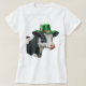 T-shirt for St. Patrick's Day or anytime you want to display your Irish pride featuring a watercolor image of a black and white cow wearing a kelly green top hat with gold band, a white daily and shamrocks on front of hat. Additional styles available. Image may need to be adjusted for varying sizes.