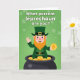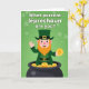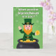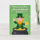 This card features a smiling cartoon leprechaun in rich emerald greens, with rosy cheeks and a fiery orange beard that draws your eye right away 💚. He wears a deep green top hat and matching coat, each finished with shiny gold buckles, and his friendly expression feels like he’s sharing a private joke with you. The leprechaun pops up from a stout midnight-black pot that’s stuffed with gold coins, many stamped with dollar signs, adding a cheeky touch of “lucky find.” One hand lifts in a welcoming wave while the other holds up an oversized coin, as if offering it to a close friend. Behind him, the background stays a softer green with faint shamrock shapes drifting across it, giving the scene a gentle St. Patrick’s Day atmosphere ☘️. Across the top, the question “What percent leprechaun are you?” is set in bold white lettering, centered and easy to read against the green. The gold coins gleam in clustered layers around the pot’s rim, with the brightest highlights catching along their edges.