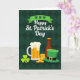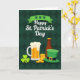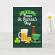This greeting card features a deep emerald background with a subtle diamond pattern, setting a cozy St. Patrick’s Day scene that feels made for sharing a toast with someone close 💚. Across the upper area, a bright green banner stretches wide with the words “Happy St. Patrick’s Day” written in white, with a shamrock on each side. Below it, a frothy mug of golden beer spills over slightly, suggesting a friendly clink and an easy laugh between companions. Nearby, a stack of gold coins with a few scattered pieces adds a hint of lucky mischief, like a shared secret about where the treasure might be. A brown bottle with a yellow cap stands alongside, balancing the layout and giving the table-top arrangement a casual, pub-like feel. On the right, a green leprechaun hat with a black band and gold buckle sits at an angle, as if someone just set it down after leaning in for a closer chat ☘️. A single shamrock rests on the left side of the lower section, colored in rich green against the dark background.