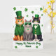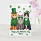 This card shows three dressed-up cats lined up across a white background dotted with faint shamrocks, setting a sweet St. Patrick’s Day scene ☘️. On the left, an orange tabby in a green hoodie and a leprechaun top hat leans in with bright green eyes that seem to glance toward the others like an eager friend. In the middle, a fluffy grey cat wears green sunglasses, and a small shamrock pin sits above a tiny red heart on its chest, hinting at a quiet, affectionate bond. On the right, a black-and-white tuxedo cat wears a green jacket with a matching bow tie and a small leprechaun hat, holding a steady, tender gaze with wide green eyes 💚. The colors stay mostly green against the white space, with the warm orange fur and that little red heart adding gentle contrast. Near the bottom, the message “Happy St, Patrick’s Day Nana” appears in green lettering, easy to spot without covering the cats. The shamrocks remain lightly scattered around the trio, like soft confetti floating behind their outfits.