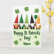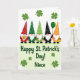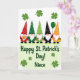 This greeting card shows five gnomes lined up side by side like close friends posing for a St. Patrick’s Day snapshot, their rosy noses and long white beards giving them a sweet, cozy look 💚. Each gnome wears a tall conical hat sprinkled with small white polka dots, and their outfits mix red, two shades of green, black, and bright orange for a lively holiday palette. On the far left, one gnome lifts a shiny golden mug as if toasting the others, while another toward the right holds a deep green balloon that leans gently into the group ☘️. The gnome on the far right presents a tiny pot of gold, angled forward like a little gift being offered. Above their hats, four-leaf clovers drift across the top area, adding a light, floating layer over the scene. The background is white and fades into a soft spring-green near the bottom, where small shamrock shapes are scattered like confetti on the ground. Across the lower half, the message “Happy St. Patrick’s Day! Niece,” appears in large friendly green lettering, centered and easy to read. The clovers hover overhead while the lower edge stays softly green with scattered shamrocks beneath the gnomes’ feet.