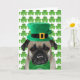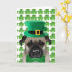 A picture of a pug wearing a leprechaun outfit with shamrocks in the background.