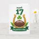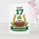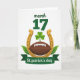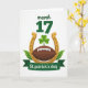 This greeting card features a white background with a centered St. Patrick’s Day layout that leads your eye from the bottom banner up to the date at the top. Across the top, “march 17” appears in emerald green lettering, standing out sharply against the open space. In the middle, a golden horseshoe frames a brown American football with white laces, and a small green shamrock rests above it, like a shared lucky charm between close friends 💚. Near the bottom, a flowing green ribbon banner carries the words “St. Patrick’s day” in white lettering, curling gently as if it’s being held up for someone special ☘️. The green and gold accents keep the scene festive while leaving plenty of breathing room around the main symbols. The shapes are tidy and evenly spaced, with the horseshoe and football sitting squarely on the central line of the design. At the base, the ribbon’s ends sweep outward in soft curves beneath the centered emblem.